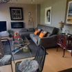 Desde el salón, ventanal al exterior y jardín con muebles de exterior para el descanso y las comidas.