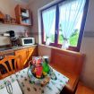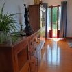 La casa es de una planta baja, está distribuida en amplio salón con sofá-cama, cocina separada con frigorífico, lavadora, horno, microondas, campana extractora y zona de comidas con banc, sillas y mesa.