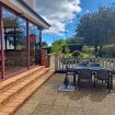 Porche acristalado en el exterior para las comidas y amplio y cuidado jardín.