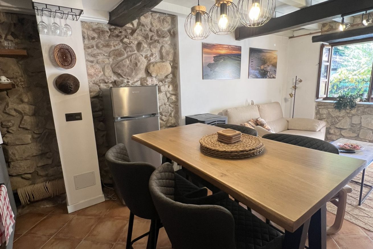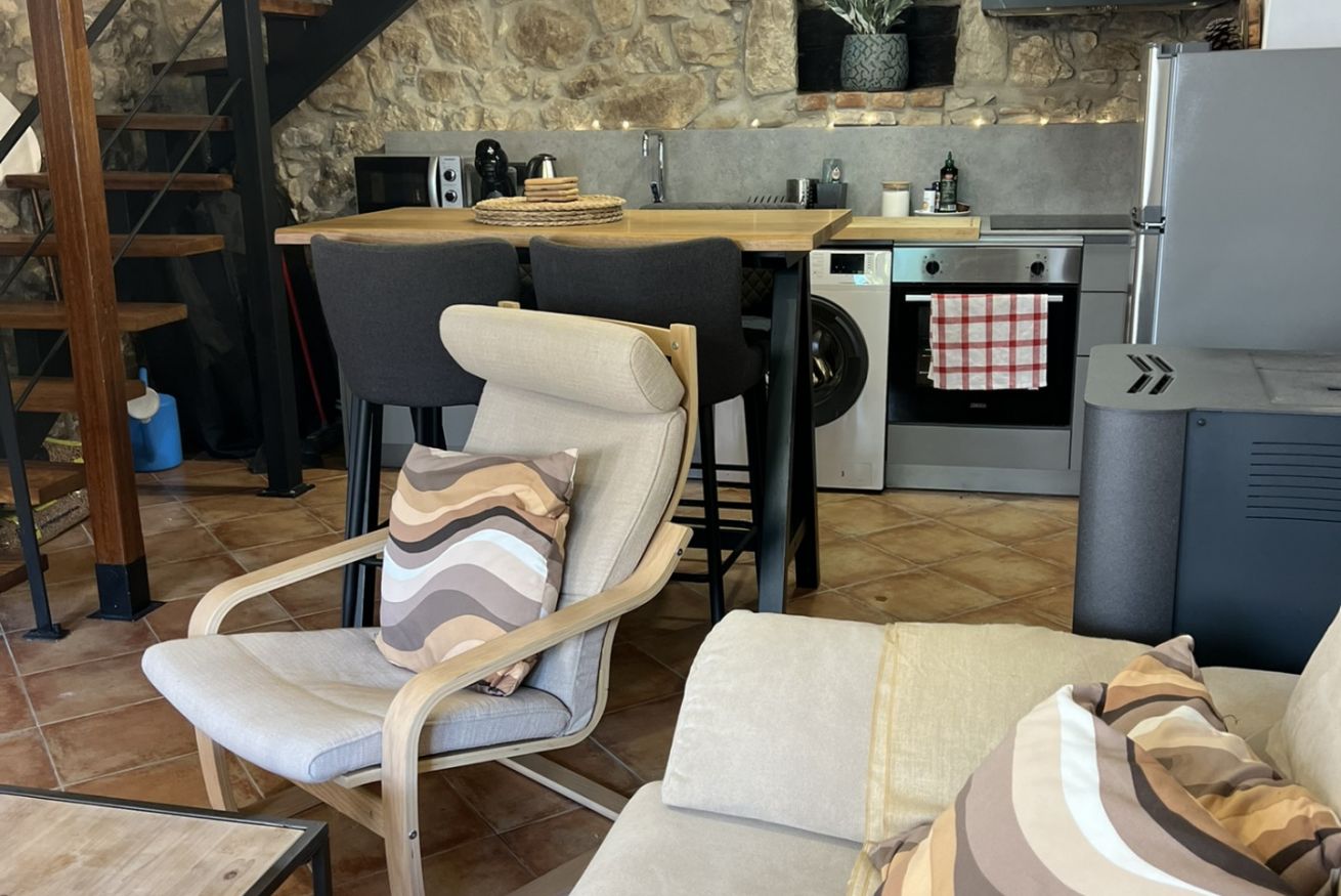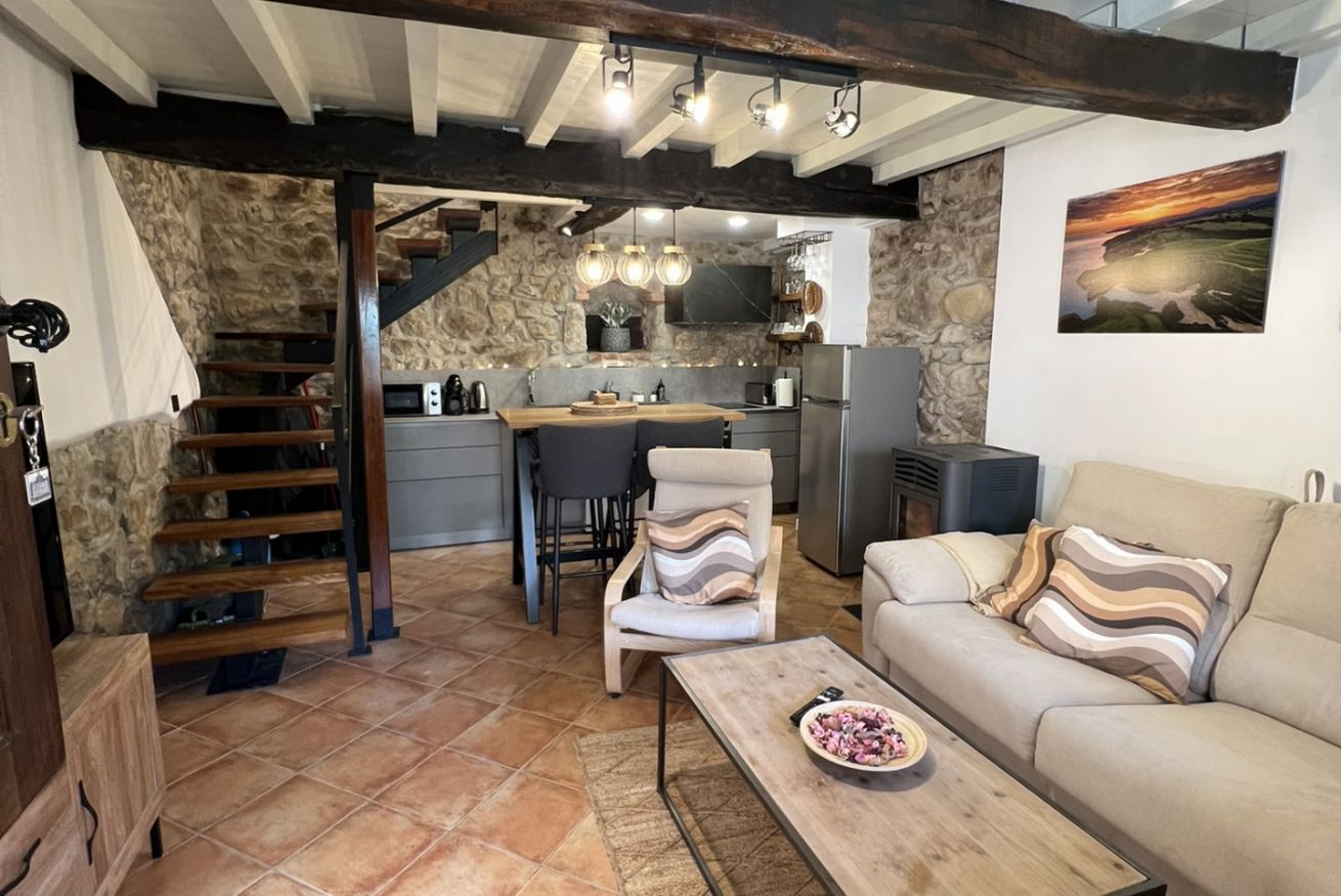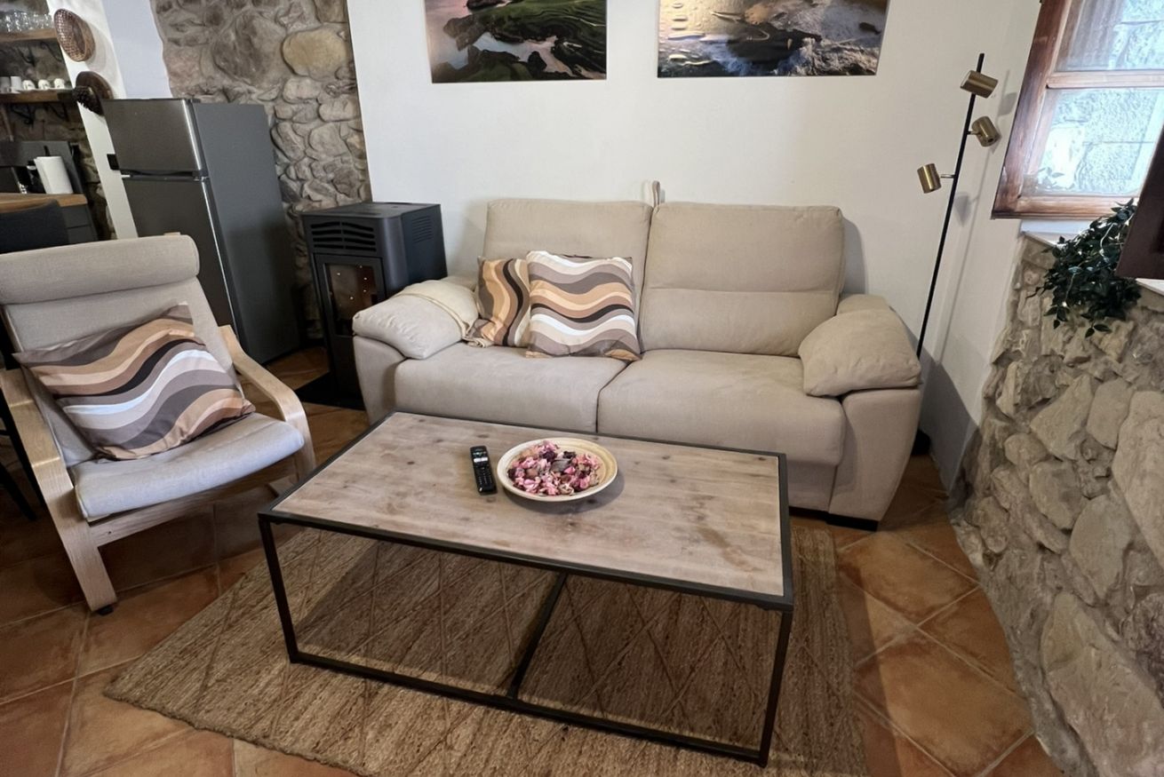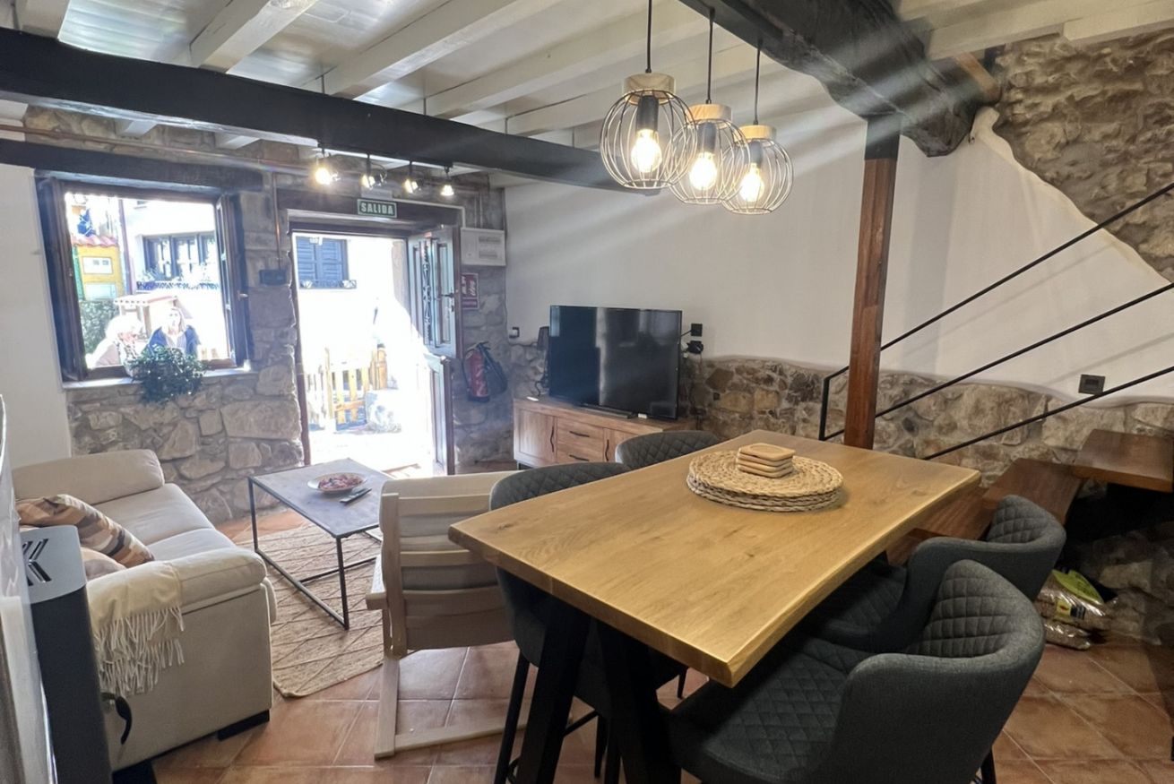 Accedemos a la casa por la terraza donde podremos hacer las comidas en verano, en planta baja se encuentra la moderna cocina y salón con chimenea de pellets generando un entorno muy cálido en los meses de otoño-invierno.