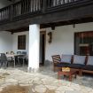 En el exterior bajo el corredor, sofá de exterior y mesa con bancos para las comidas al aire libre.